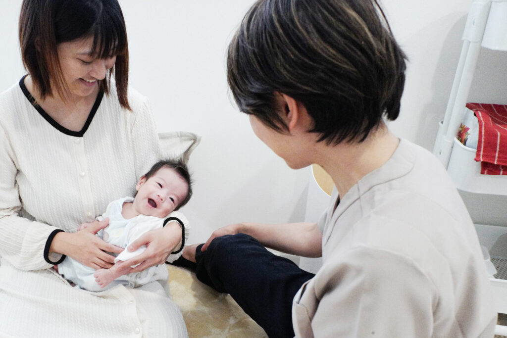 順番にヘッドマッサージを受けていただきますので、施術を待つ間は赤ちゃんと過ごしたり、助産師とお話したりして、ほっと安心できる時間を過ごしていただけます。パパとママが一緒に笑顔になれるよう、丁寧にサポートします。